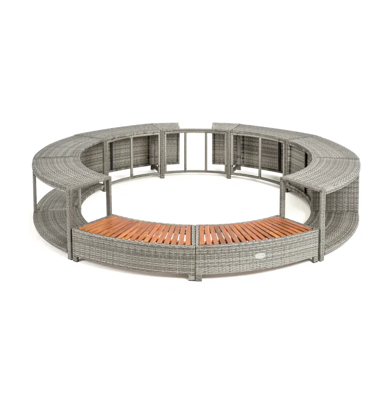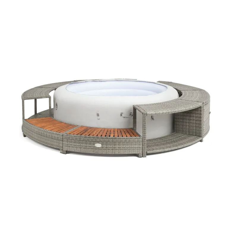 Vous souhaitez allier protection et élégance ? Avec l’entourage en rotin gris pour spa gonflable Lay-Z Spa, vous serez en mesure d’abriter efficacement votre spa Bestway rond. Fabriqué en résine tressée, ce dernier supportera aisément l’humidité provenant de votre jacuzzi gonflable Lay-Z Spa. La légèreté de la résine vous permettra de l’installer ou de le démanteler facilement au gré des déplacements de votre spa. Hormis son rôle protecteur, le design de ce produit a été pensé pour permettre une intégration parfaite au sein de votre extérieur ou de votre intérieur. L’alliance de la résine tressée et du bois de cet habillage pour spa donnera à votre bain à bulles un aspect de salon de jardin du plus bel effet. Le marchepied en bois traité imputrescible facilite l’accès au bassin pour les personnes souffrant d’arthrose ou de douleurs musculaires. Pour finir, la praticité de cet entourage de spa est également à souligner. Ce dernier contient un espace dédié pour entreposer votre bloc technique. Ainsi, ce dernier se trouvera à l’abri des intempéries et de la saleté. Des rangements présents dans l’entourage vous serviront également à ranger vos effets personnels (téléphone, livre, lunettes) pour éviter de les faire tomber dans l’eau.